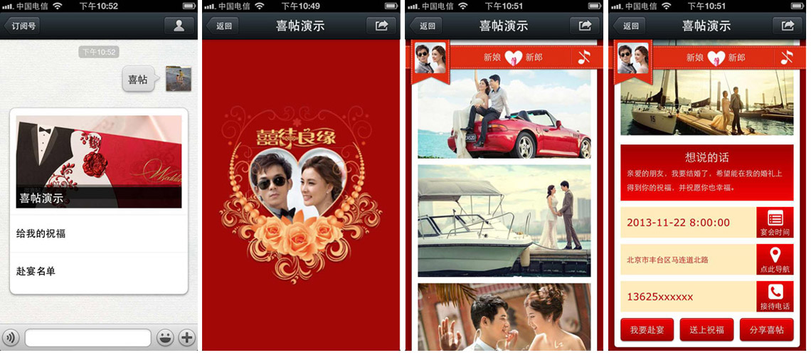 微喜帖是针对结婚庆典而推出的一款行业产品,主要是为计划结婚的用户们,通过使用微喜帖应用来向亲朋好友传播自己即将结婚的动态,可以展现用户想要表达的话、结婚日期、地址、导航、接待电话,同时亲朋好友可以在微喜帖平台上提交赴宴通知、送上祝福,并且转发喜帖。